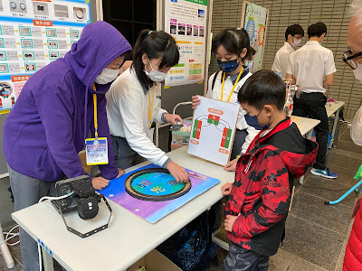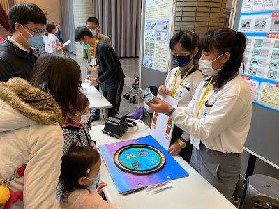 學生簡報完趕回攤位接手向參觀民眾解說磁浮光車原理